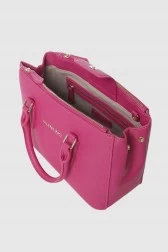 Mała różowa shopperka z nóżkami. Komora zamykana na magnes, do tego dwie kieszenie na zamek. Wewnątrz jedna duża zasuwana kieszeń oraz dwie wsuwane.