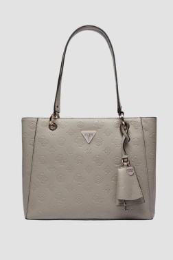Szara shopperka "Jena Noel Tote" marki Guess. Torebka wykonana ze skóry ekologicznej, wysokość uchwytów wynosi 25 cm. W środku znajdują się dwie komory: jedna wsuwana, dwie zamykane na zamek, podzieloną przegródką; trzy kieszenie: dwie wsuwane, jedna zasuwana na zamek. Spód torebki chronią nóżki. W zestawie woreczek przeciwkurzowy.