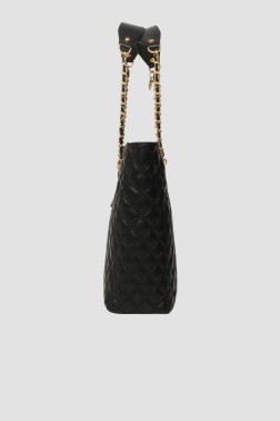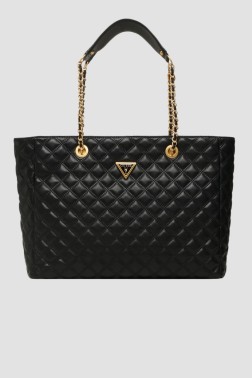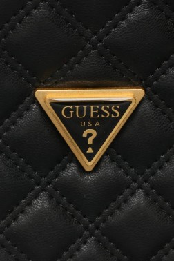 Czarna damska torebka Giully Tote marki Guess to stylowy i funkcjonalny dodatek wykonany z ekologicznej skóry. Torebka posiada jedną dużą komorę zamykaną na zamek, a wewnątrz dwie wsuwane kieszenie oraz jedną kieszeń zasuwaną. Na zewnątrz znajduje się dodatkowa kieszeń na zamek oraz nóżki ochronne, które zabezpieczają spód torebki. Uchwyt o wysokości 25 cm zapewnia wygodę noszenia. W zestawie znajduje się worek przeciwkurzowy, który chroni torebkę podczas przechowywania.