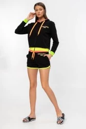 Bawełniana bluza damska MOSCHINO SWIM w kolorze czarnym. Na piersi nadruk z neonowym logo w kolorach: żółtym, zielonym, różowym i pomarańczowym. Zapinana na zamek. Kaptur z różową podszewką, ściągany pomarańczowymi sznurkami. Dół i rękawy zakończone ściągaczami w kolorze neonowo-żółtym i neonowo-zielonym.