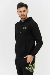 Bawełniana bluza męska EA7 EMPORIO ARMANI w kolorze czarnym z kapturem. Z przodu małe, a z tyłu duże neonowe logo. Z przodu duża wsuwana kieszeń. Kaptur ściągany trokami. Dół i rękawy zakończone prążkowanym ściągaczem.