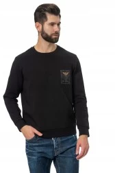 Czarna bluza męska EMPORIO ARMANI z małym złotym printem pokrytym transparentnym materiałem, co tworzy ciekawy efekt optyczny. Dół i rękawy zakończone ściągaczami.