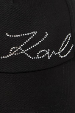 Czarna damska bawełniana czapka z daszkiem K/signature Rhnstn, marki Karl Lagerfeld.