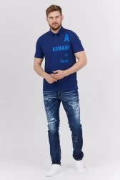 Męska koszulka polo ARMANI EXCHANGE w kolorze granatowym ozdobiona niebieskim nadrukiem.