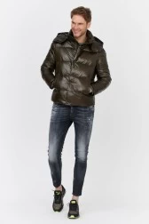 Puchowa kurtka męska EMPORIO ARMANI w kolorze ciemnozielonym. Z przodu dwie kieszenie na zatrzask. Wewnątrz dwie kieszenie na suwak. Kurtka zapinana na suwak dwubiegowy oraz zatrzaski z logo. Odpinany kaptur ściągany trokami z metalowymi końcówkami. Rękawy wykończone ściągaczami z logo. Wewnątrz obrandowane szelki.