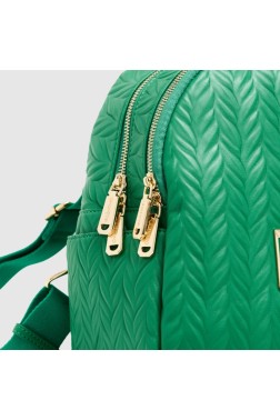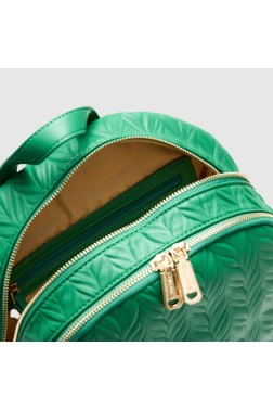 Zielony tłoczony plecak z logo VALENTINO. Posiada dwie komory zasuwane na podwójny zamek. Po bokach znajdują się dwie kieszenie. W środku jedna zasuwana kieszonka i przegródka. Uchwyt do ręki. Regulowana długość pasków.