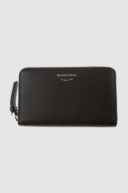 Portfel damski EMPORIO ARMANI średniej wielkości w kolorze czarnym. Z przodu logo firmy w kolorze złotym. Portfel zapinany na zamek. 6 miejsc na karty i 2 przedziały na banknoty. Kieszeń na monety zapinana na zamek.