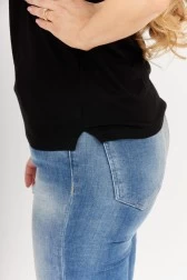 Modelka ma na sobie t-shirt w rozmiarze S