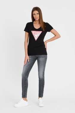 Czarny damski t-shirt Satin Triangle Tee, marki Guess.