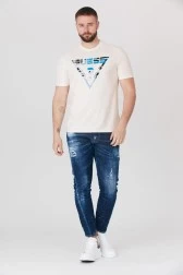Męski t-shirt GUESS w kolorze śmietankowej bieli. Z przodu duże trójkątne logo w moro.