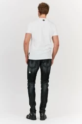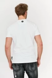 T-shirt męski w kolorze białym. Ozdobiony dużą aplikacją czaszki z kryształków górskich w kolorach: srebrnym i czarnym. Z tyłu metalowe logo w kolorze srebrnym. Koszulka ma okrągły, prążkowany dekolt.