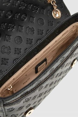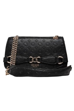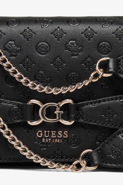 Czarna logowana torebka Arlena marki Guess. Klapa zamykana na magnes, wewnątrz jedna kieszeń zasuwana, jedna wsuwana i sześć miejsc na karty. W zestawie woreczek przeciwkurzowy.