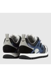 Чоловічі кросівки EMPORIO ARMANI чорного кольору. Верх із замшевих та шкіряних елементів синього, сірого, білого та чорного кольорів. Невеликий логотип збоку. Назва компанії на язичку та логотип на п'яті. Сріблясті смужки на носі. Підошва біло-чорного кольору.