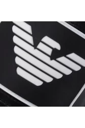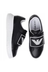 Чорні чоловічі кросівки Emporio Armani. Застібка на липучках. Білий гумовий логотип бренду на застібці, на язичку на липучці, чорна тканина з назвою бренду при від'єднанні. Біла підошва.
