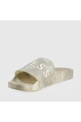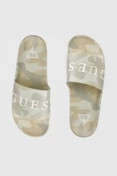 Чоловічі шльопанці GUESS бежевого кольору з візерунком моро і рельєфним логотипом.