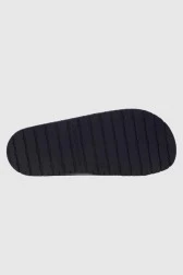 Чоловічі шльопанці темно-синього кольору з логотипом, вишитим на тканині.