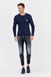 Чоловічий лонгслів EMPORIO ARMANI UNDERWEAR темно-синього кольору. Спереду логотип сріблястого кольору та вишитий смайлик червоного кольору. Ребриста кругла горловина.