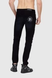 Чорні чоловічі джинси BALMAIN із застібкою на ґудзиках. Три прорізні кишені спереду і дві на блискавках сріблястого кольору. Декоративна строчка на стегнах і колінах. Ззаду дві врізні кишені. Білий логотип праворуч.
