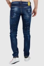 Чоловічі джинси на ґудзиках темно-синього кольору. Прикрашені потертостями та плямами. Три спереду, дві кишені ззаду, дві прорізні ззаду. Червона етикетка з логотипом спереду на застібці. Жовта етикетка ззаду.