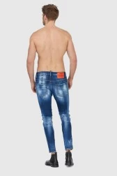 Чоловічі джинси Dsquared2 синього кольору. Декоровані потертостями, дірками і плямами білого кольору. Червона етикетка з логотипом спереду. Помаранчева етикетка ззаду. Застібка на ґудзиках. Три спереду, дві накладні кишені ззаду.