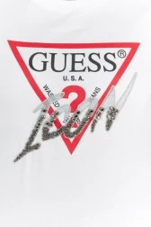 Жіноча футболка GUESS ICON білого кольору. Спереду трикутний логотип з бісеру, вишитий бісером.