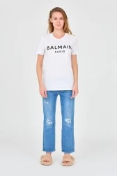 Біла жіноча футболка з трьома золотими декоративними ґудзиками.