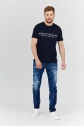 Чоловіча футболка ARMANI EXCHANGE темно-синього кольору з білою аплікацією логотипу. Круглий ребристий виріз горловини.