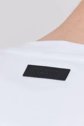 Чоловіча футболка білого кольору. Прикрашена металевим логотипом. Кілька логотипів на шкіряній етикетці ззаду. Футболка має круглий ребристий виріз горловини.