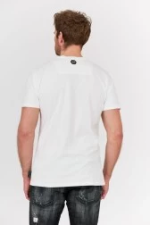 Чоловіча футболка білого кольору. Прикрашена великою аплікацією черепа зі стразами сріблястого, чорного та червоного кольорів. Металевий логотип сріблястого кольору на спині. Футболка має круглий ребристий виріз горловини.