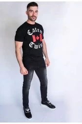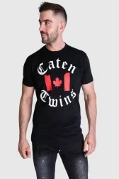 Чоловіча футболка Dsquared2 чорного кольору. Принт 'Caten Twins' і кленовий лист спереду. Логотип з принтом на спині. Ребристий виріз горловини.