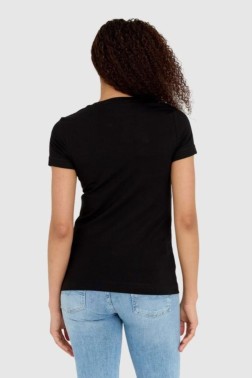 Чорна жіноча футболка з невеликим логотипом бренду Guess.