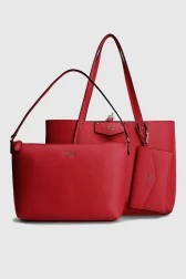 Двостороння сумочка GUESS. Одна сторона червоного кольору, інша - бежевого. Включає в себе знімну сумку і меншу сумочку (одна кишеня на блискавці всередині, три кишені на блискавці).