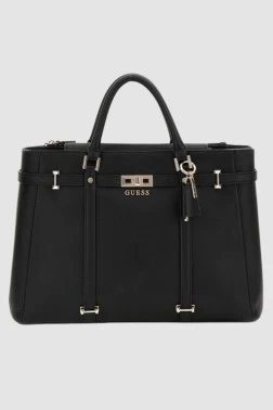 Чорна жіноча сумка Emilee від Guess. Сумочка закривається на магніт. Має три відділення: дві кишені на блискавці, одну кишеню на блискавці, дві кишені на блискавці, дві кишені на блискавці та регульований ремінець.