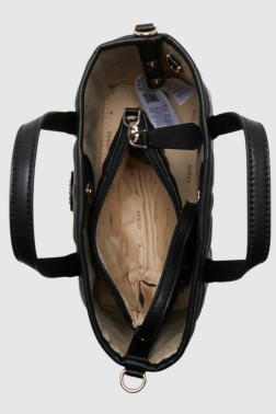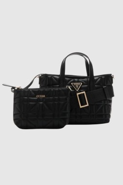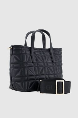 Маленька класична чорна стьобана сумочка Latona Mini Tote від Guess. Внутрішнє відділення закривається на магніт. Сумка має ручки та регульований ремінець з логотипом. Поставляється з мішечком для пилу і чохлом (розміри 19 см х 13 см х 2 см) з ремінцем (30 см), який закривається на блискавку.
