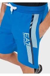 Чоловічі спортивні шорти EA7 Emporio Armani синього кольору з бавовни. Прикрашені на лівій штанині смужками та логотипом у біло-чорному кольорі. Пояс на шнурку зі штанинами білого кольору. Дві врізні кишені.