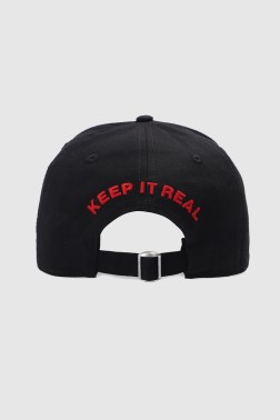 Бейсболка чорного кольору. Логотип спереду. Вишитий напис і регульований ремінець ззаду. Ефект зношеності.