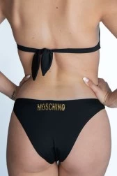 Плавки бікіні Moschino чорного кольору. Модель з гладкої тканини. Металевий логотип золотистого кольору збоку. Фірмовий принт золотистого кольору ззаду.