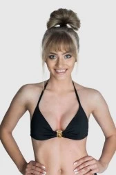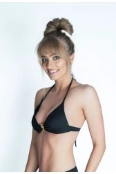 Бюстгальтер без кісточок Moschino чорного кольору. Модель з гладкого матеріалу. М'які чашечки. Металевий логотип золотистого кольору спереду. Зав'язка на спині.