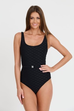 Чорний купальник з монограмою Kl від Карла Лагерфельда. Заміри моделі: зріст 176 см, обхват грудей 85 см, талія 65 см, стегна 92 см.