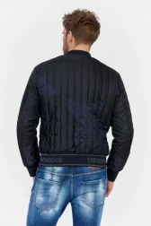 Dwustronna kurtka męska EMPORIO ARMANI. Jedna strona czarna, pikowana w granatowy wzór moro. Druga strona szara z małym logo na piersi. Zapinana na suwak dwubiegowy. Z przodu dwie kieszenie. Kurtka wykończona ściągaczem przy mankietach, szyi oraz w pasie. Ściągacz w pasie z dużym logo w kolorze szarym.