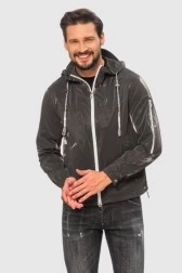 Чоловіча куртка EMPORIO ARMANI сірого кольору. Білий логотип на спині та декоративна застібка-блискавка на лівому рукаві. Куртка з ультралегкої, водонепроникної і вітрозахисної технічної тканини Extra Shiny Glass. Застібка на білу блискавку. Капюшон з козирком, куліска з металевими обмежувачами. Дві бокові кишені на блискавці. Всередині дві кишені на блискавці та знімні шлейки. Манжети з ребристими манжетами з прес-шпильками. Регульована резинка на талії.
