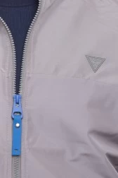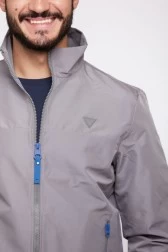 Przejściowa kurtka męska firmy GUESS w kolorze szarym ze stójką. Na lewej piersi aplikacja z trójkątnym logo w kolorze szarym. Kurtka zapinana na suwak. Z przodu dwie kieszenie zapinane na suwak. Wewnątrz jedna kieszeń na suwak. Mankiety oraz dół wykończone ściągaczem. Kurtka jest wiatroszczelna.