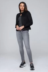 Modelka ma na sobie kurtkę w rozmiarze S.