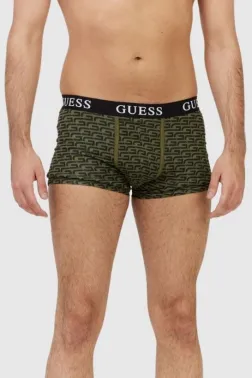Три пари чоловічих трусів-боксерів GUESS з органічної бавовни. Зелені з чорним візерунком, оздоблені чорною гумкою з білим логотипом. Морські з білою гумкою з логотипом. Зелені з білою резинкою з чорним логотипом.