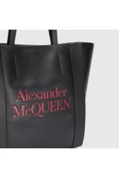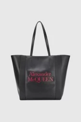 Велика сумочка Alexander McQueen (вміщує А4) чорного кольору з натуральної шкіри. Рельєфний логотип спереду червоного кольору. Застібка на магніті. Червоний інтер'єр. Внутрішня кишеня на блискавці.