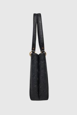 Чорна сумка Izzy Peony Noel Tote від Guess. Має два відділення, одну кишеню на блискавці та дві кишені на застібці. Дно сумки захищене ніжками. Сумочка закривається на блискавку.