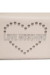 Шкіряна сумочка LOVE MOSCHINO кольору слонової кістки. Спереду сріблястий логотип у вигляді шипованого серця. Клапан прикрашений сріблястими шпильками по краю. Сумочка на розсувному сріблястому ланцюжку зі шкіряними ручками. Застібається на два магніти. Всередині одна кишеня і одна кишеня на блискавці.