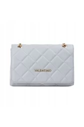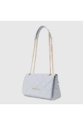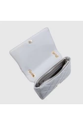 Стьобана сумка сірого кольору. Ремінець у вигляді ланцюжка золотистого кольору з сірими погонами. Клапан на застібці, відділення на блискавці. Всередині одна кишеня на блискавці та відділення.