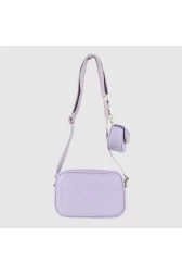 Рельєфна сумочка з логотипом і прикріпленим мішечком фіолетового кольору. Закривається на блискавку. Всередині одна кишеня на блискавці та одне невелике відділення.