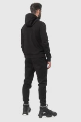 Чорний чоловічий спортивний костюм від EA7 Emporio Armani з логотипом неонового жовтого кольору. Спортивний костюм складається з худі на блискавці з двома кишенями. Низ і рукава світшоту оздоблені ребристими манжетами. Штани зі шнурком на талії та шнурком всередині, з двома врізними кишенями. Завужені штанини з ребристими манжетами.